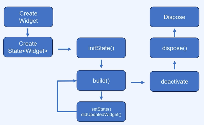 - 업데이트: setState 메서드가 호출되어 위젯 상태가 변경되면 build 메서드가 다시 호출되어 위젯 트리가 업데이트됩니다.